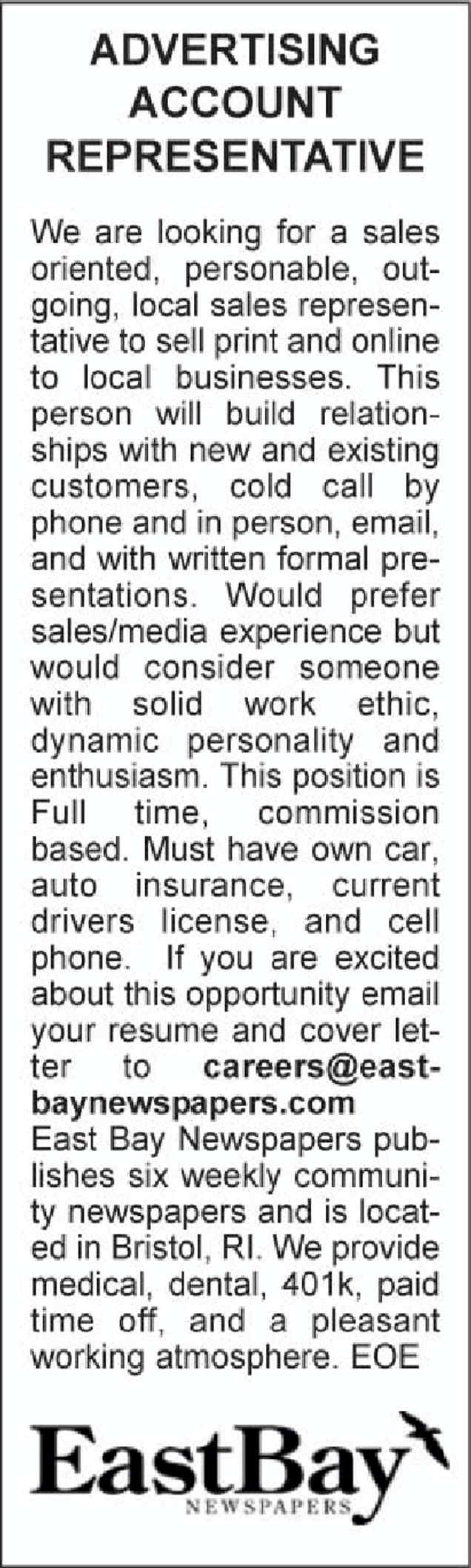 ADVERTISING ACCOUNT REPRESENTATIVE We are looking for a sales oriented, personable, outgoing, local sales representative to sell print and online to local businesses. This person will build relationships with new and existing customers, cold call by phone and in person, email, and with written formal presentations. Would prefer sales/media experience but would consider someone with solid work ethic, dynamic personality and enthusiasm. This position is Full time, commission based Must have own car, auto insurance, current drivers license, and cell phone. If you are excited about this opportunity email your resume and cover letter to careers@east-baynewspapers.com East Bay Newspapers publishes six weekly community newspapers and is located in Bristol, RI. We provide medical, dental, 401k, paid time off, and a pleasant working atmosphere, EOE East Bay Newspapers