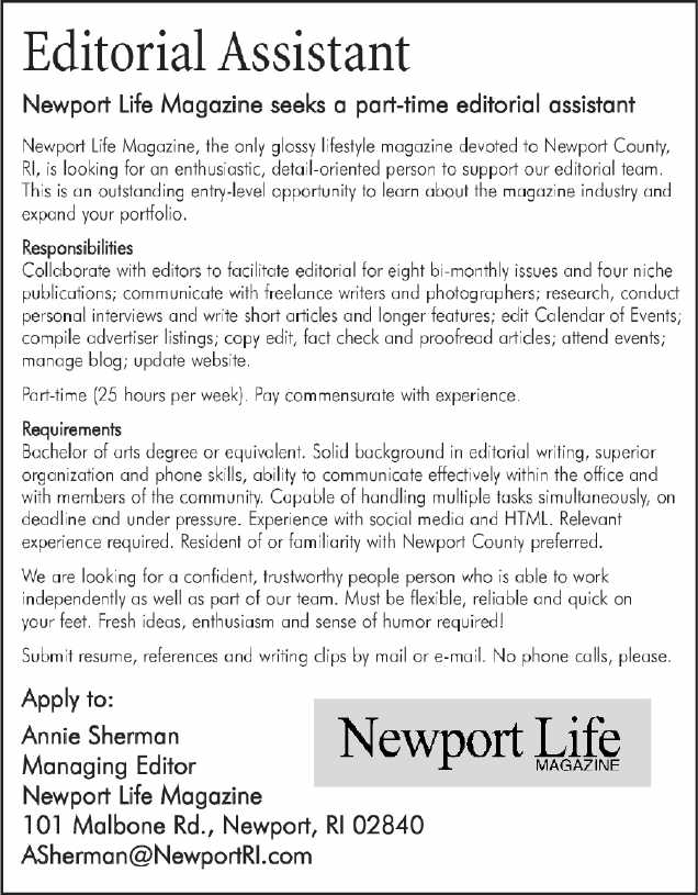 Editorial Assistant Newport Life Magazine seeks a part-time editorial assistant Newport Life Magazine, the only glossy lifestyle magazine devoted to Newport County, RI, is looking for an enthusiastic, detail-oriented person to support our editorial team. This is an outstanding entry-level opportunity to learn about the magazine industry and expand your portfolio. Responsibilities Collaborate with editors to facilitate editorial for eight bi-monthly issues and four niche publications; communicate with freelance writers and photographers; research, conduct personal interviews and write short articles and longer features; edit Calendar of Events; compile advertiser listings; copy edit, fact check and proofread articles; attend events; manage blog; update website. Part-time (25 hours per week). Pay commensurate with experience. Requirements Bachelor of arts degree or equivalent. Solid background in editorial writing, superior organization and phone skills, ability to communicate effectively within the office and with members of the community. Capable of handling multiple tasks simultaneously, on deadline and under pressure. Experience with social media and HTML. Relevant experience required. Resident of or familiarity with Newport County preferred. We are looking for a confident, trustworthy people person who is able to work independently as well as part of our team. Must be flexible, reliable and quick on your feet. Fresh ideas, enthusiasm and sense of humor required! Submit resume, references and writing clips by mail or e-mail. No phone calls, please. Apply to: Annie Sherman Managing Editor Newport Life Magazine 101 Malbone Rd., Newport, RI 02840 ASherman@NewportRI.com Newport Life MAGAZINE